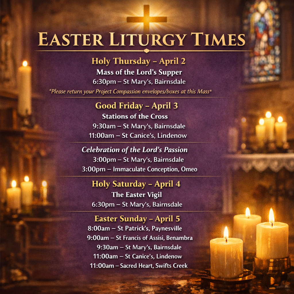 MASS TIMES St Mary’s, Bairnsdale – Tuesday to Friday: 9:30 AM | Saturday: 6:00 PM | Sunday: 9:30 AM. Adoration of the Blessed Sacrament – Tuesday to Friday: 8:30 AM – 9:30 AM. St Patrick’s, Paynesville – Sunday: 8:00AM. St Canice’s, Lindenow – Sunday: 11:00 AM. Sacred Heart, Swifts Creek – Sunday: 11:00 AM. St Francis of Assisi, Benambra – 4th Sunday: 9:00 AM | All other Sundays: 9:30 AM Liturgy of the Word. Immaculate Conception, Omeo – Mass only when advised. SCAN QR CODE BANK DEPOSIT BSB: 083-879ACCOUNT NUMBER: 4891 94022ACCOUNT NAME: St Mary’s Parish Bairnsdale/Omeo Click to Contribute St Mary’s needs your help to restore and maintain its historic Church building.For further information or to make a donation, CLICK HERE